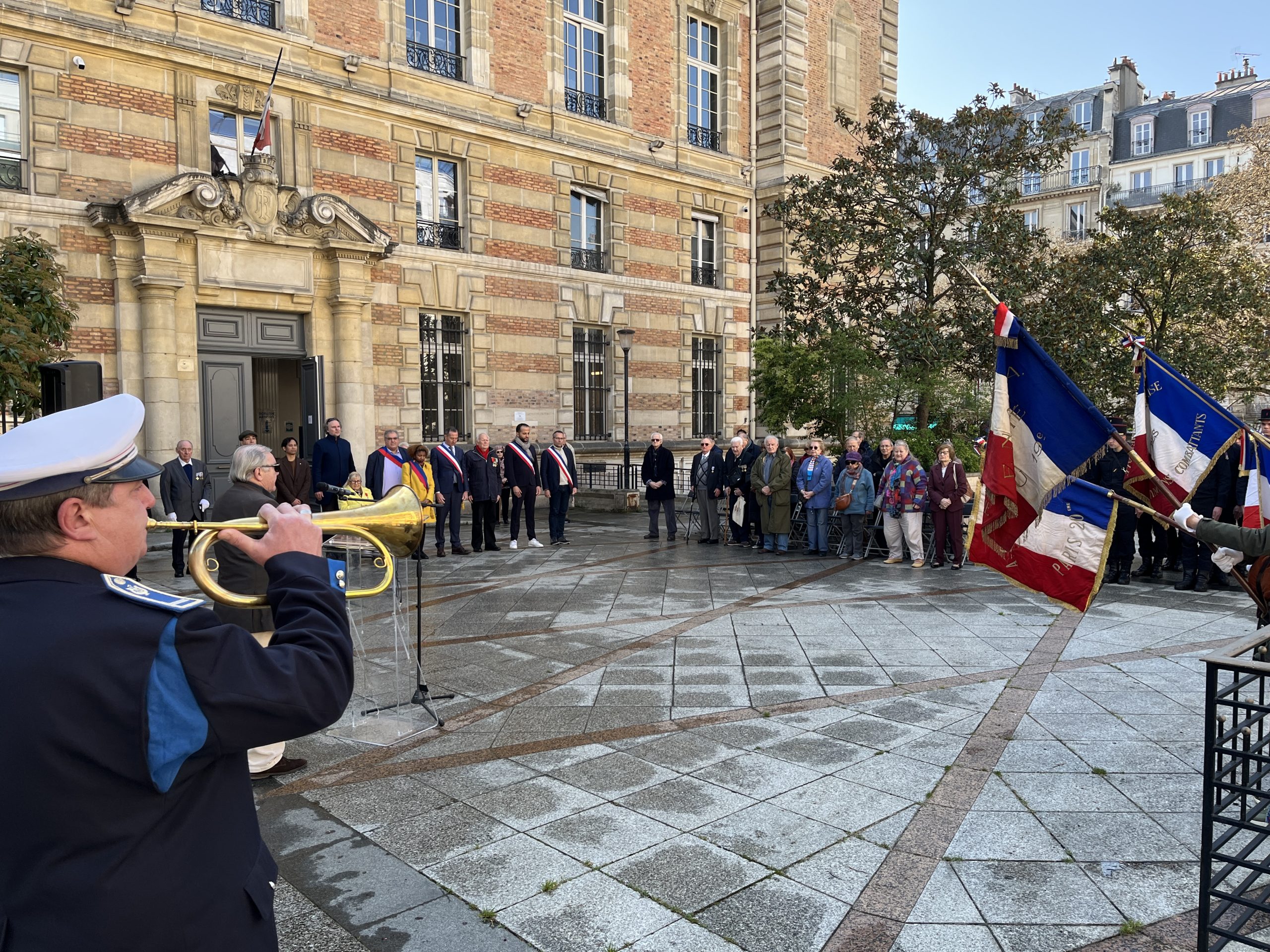 En présence des autorités de la maire de Paris, des représentants des préfets de Région et de Paris, du Président de la FNACA de Paris, des présidents d’associations d’anciens combattants et des porte-drapeaux.